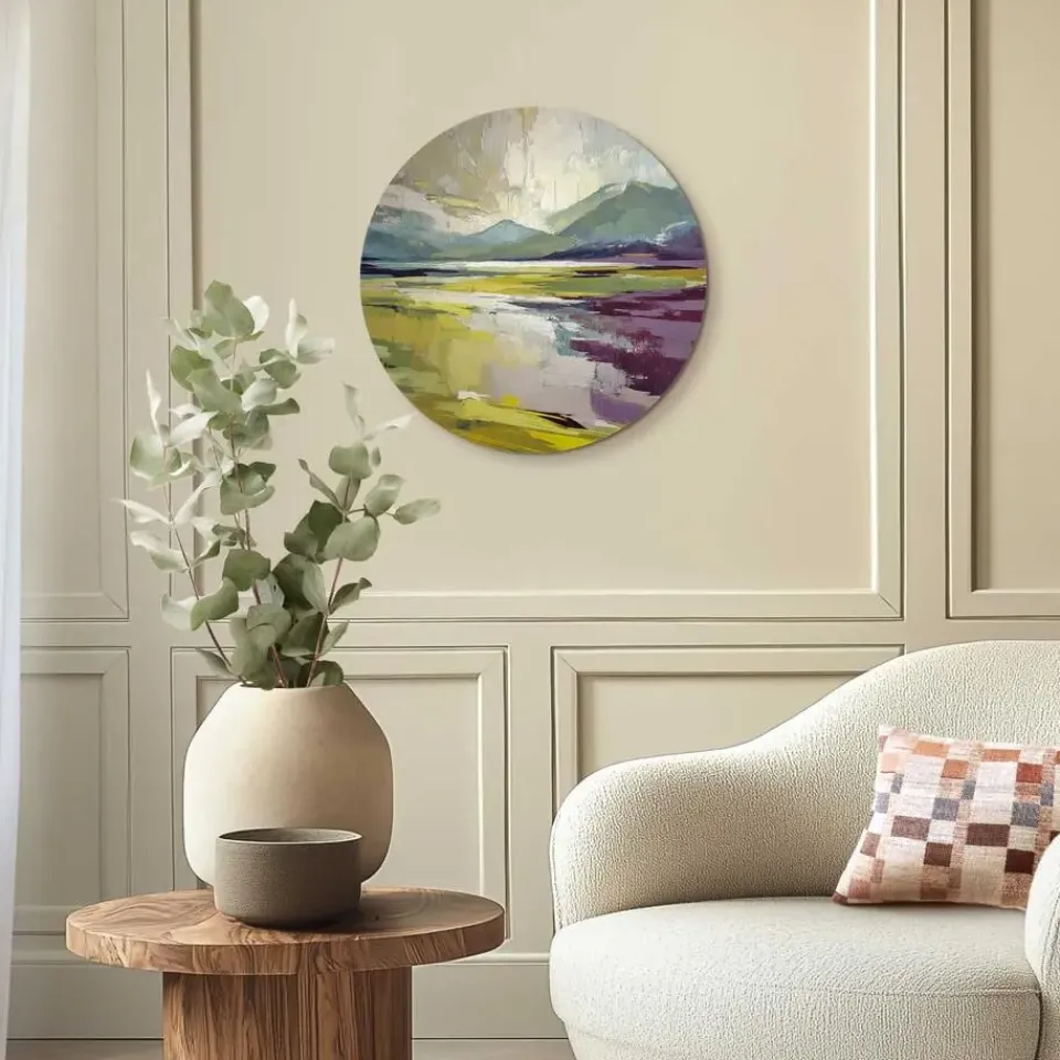 Print op 4mm dik ESG-veiligheidsglas, compleet met voorgemonteerde wandmontage en afstandhouders. De ronde vorm van de glasprint onderstreept op subtiele wijze het kenmerkende karakter van de afbeelding. Kenmerken