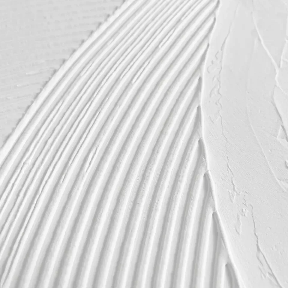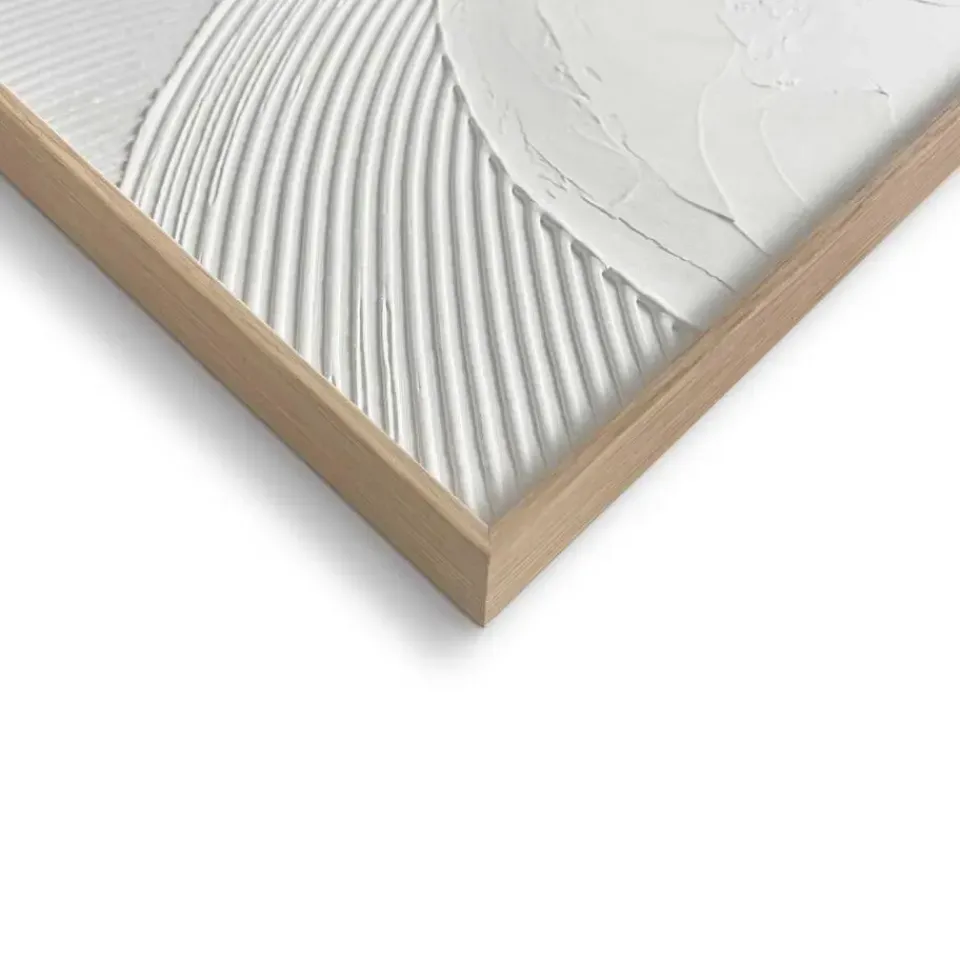 Handgemaakte wanddecoratie met abstract reliëf in wit gips omkadert door een houten lijst. Het scandinavisch minimalisme met 3d-textuur past in de meeste moderne woonstijlen zoals basic, vintage, urban of industrieel. Kenmerken