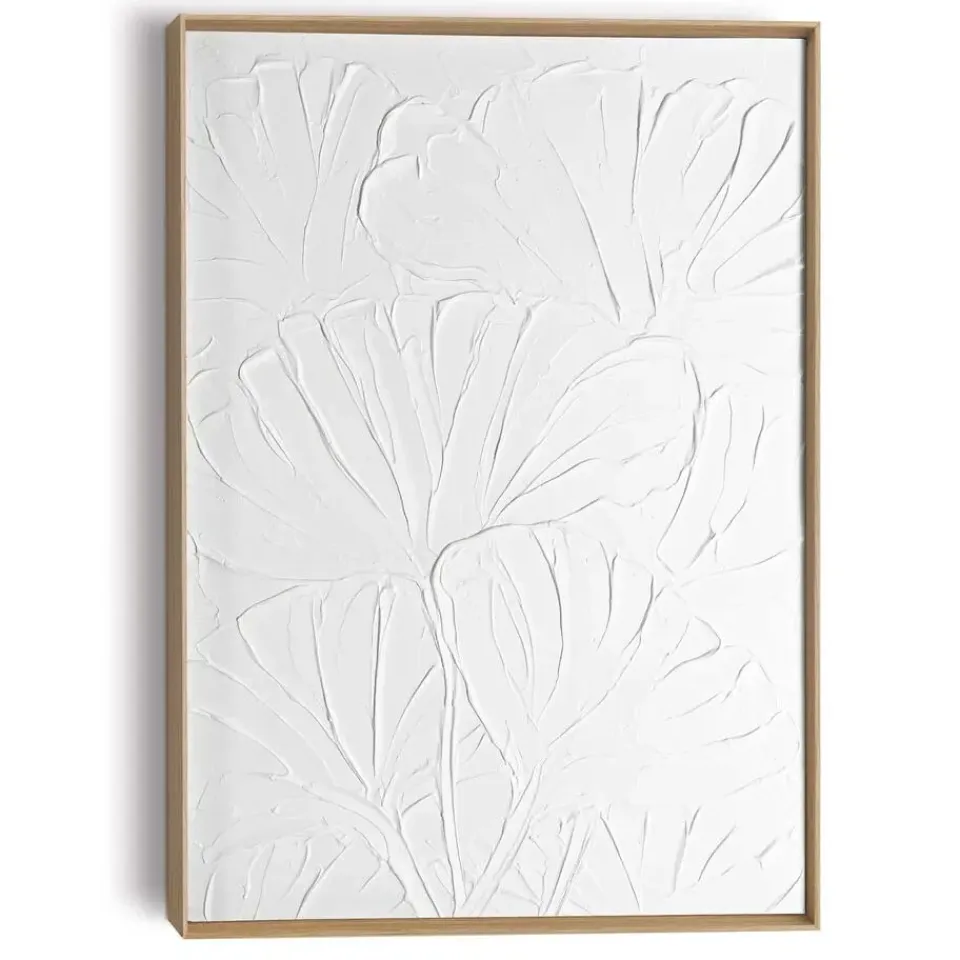 Handgemaakte wanddecoratie met abstract reliëf in wit gips omkadert door een houten lijst. Het scandinavisch minimalisme met 3d-textuur past in de meeste moderne woonstijlen zoals basic, vintage, urban of industrieel. Kenmerken