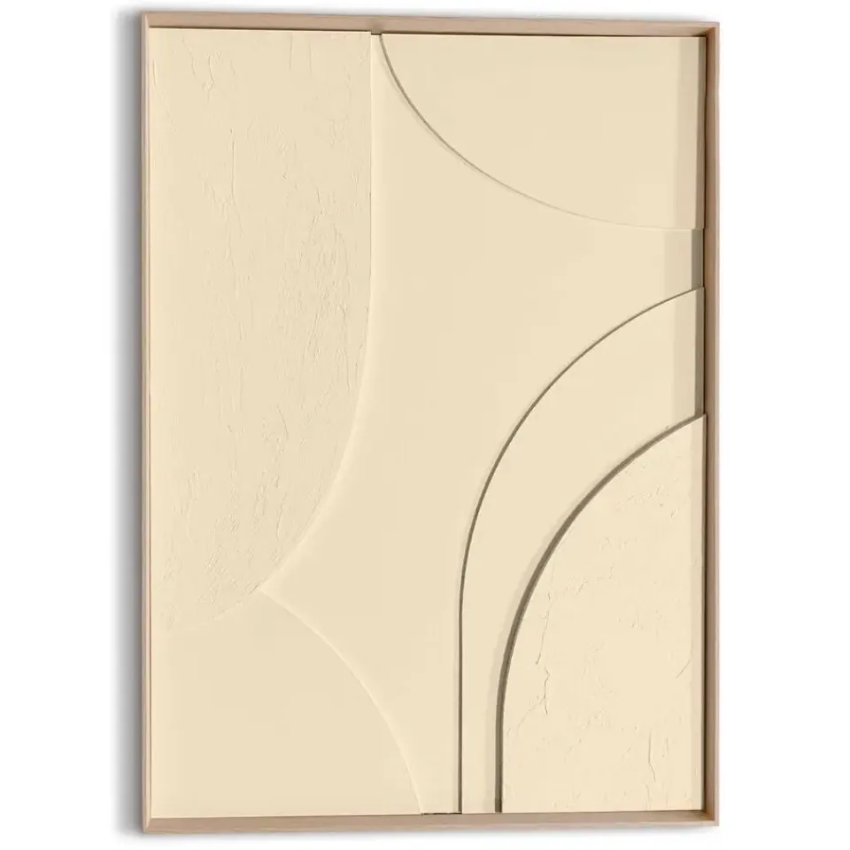 Handgemaakte wanddecoratie met abstract reliëf omkadert door een houten lijst. Het scandinavisch minimalisme met 3d-textuur past in de meeste moderne woonstijlen zoals basic, vintage, urban of industrieel. Kenmerken