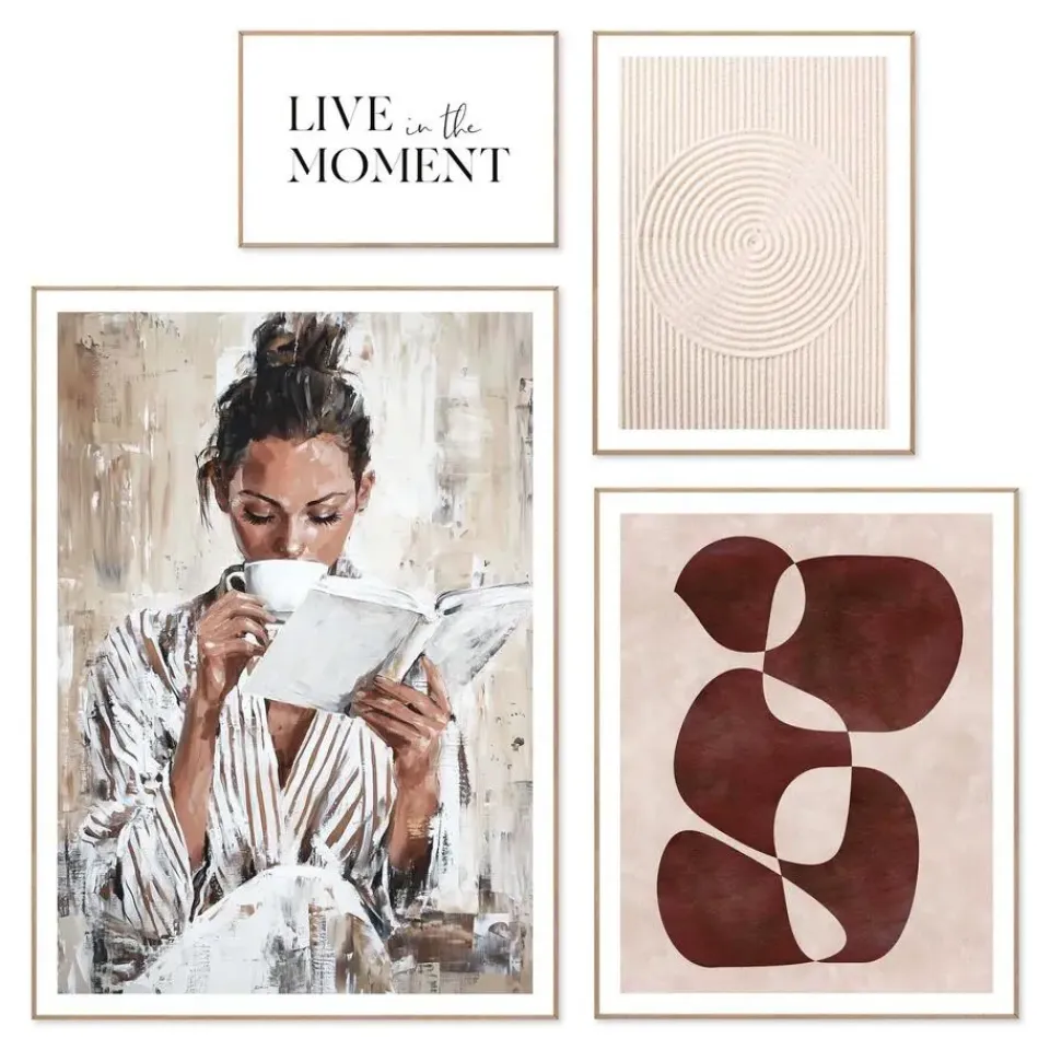Geef je interieur een persoonlijke touch met de Mix & Match 4pcs set. Deze set bestaat uit vier harmonieuze schilderijen in de formaten 50×70, 40×50, 30×40 en 20x30cm, gedrukt op stevig MDF van 3 mm dik met een eikhoutkleurige lijst. De ontwerpen sluiten perfect op elkaar aan en kunnen zowel opgehangen als neergezet worden, bijvoorbeeld op een plank, kast of dressoir. Dankzij het tijdloze design zijn ze makkelijk te combineren met verschillende woonstijlen, zoals modern, Scandinavisch of minimalistisch. Ideaal voor een speels effect aan de muur of om een lege hoek sfeervol aan te kleden. Kenmerken