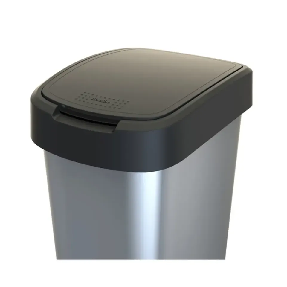 Deze rechthoekige Twist afvalbak van Rotho heeft een moderne industriële look en heeft een robuust design. De afvalbak, uitgevoerd in donkergrijs past perfect binnen iedere inrichting. Vingerafdrukken vind je niet terug op deze afvalbak en ook is hij gemakkelijk te reinigen met een doekje. Daarnaast is de afvalbak gemaakt van duurzaam kunststof en is hij voorzien van een handig kanteldeksel die op 2 manieren te openen is. De vuilniszak is eenvoudig te bevestigen aan de bak en wordt door het deksel op de plek gehouden. De afmeting van deze Twist afvalbak is 40,1 x 29,8 x 60,2 cm en heeft een inhoudsmaat van 50 liter.