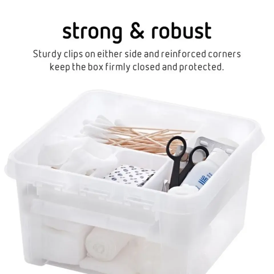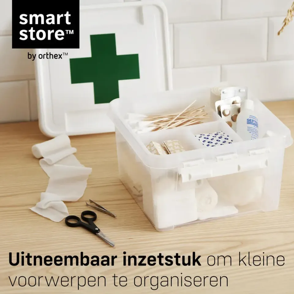 EHBO-opbergdoos met inzetstuk en gedecoreerd deksel. Perfect voor badkamer, auto, boot of caravan. Voor pleisters, verband en pijnstillers: alles op één plek, klaar voor gebruik en gemakkelijk mee te nemen.