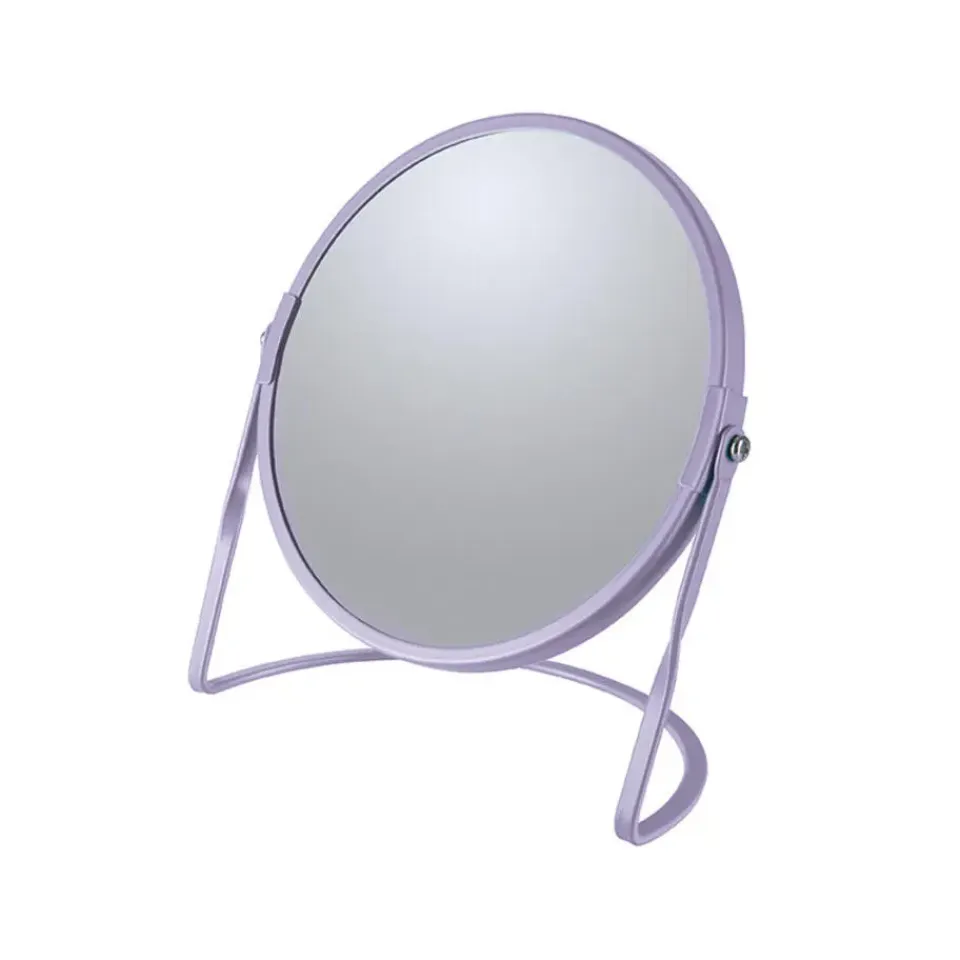 Make-up spiegel/scheerspiegel dubbelzijdig, model Cannes, met 5x zoom zijde. De spiegel heeft een normale spiegel en een spiegel met 5x vergroting. Deze badkamer spiegel is 360 graden kantelbaar met stevige vast voet. Formaat spiegel: ca. 20 cm hoog en 18 cm breed. Kleur: lila paars. Materiaal: metaal en spiegel glas. Merk: Spirella. Rond model. Badkamer accessoires – make up spiegels – metalen spiegeltje.