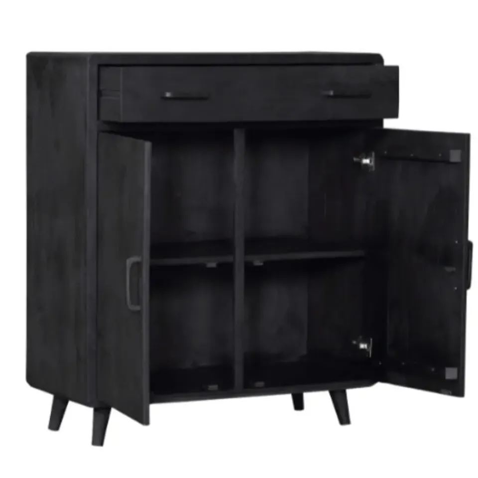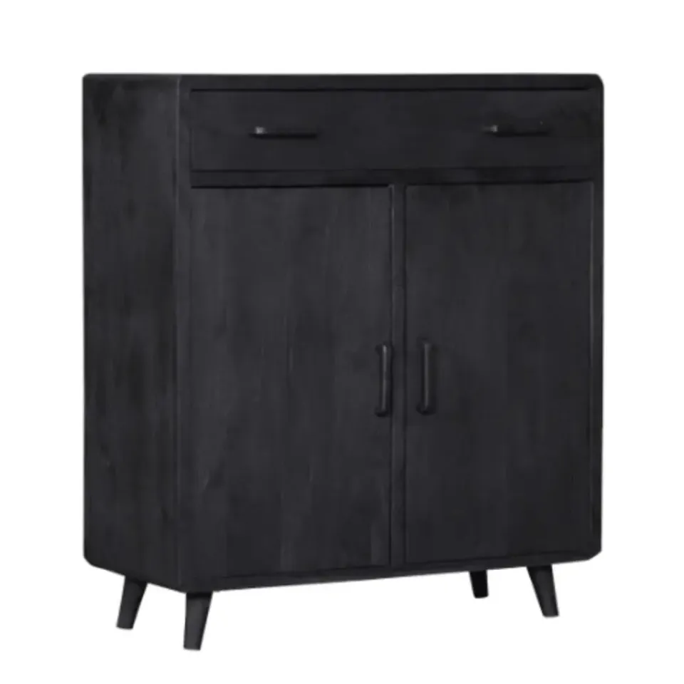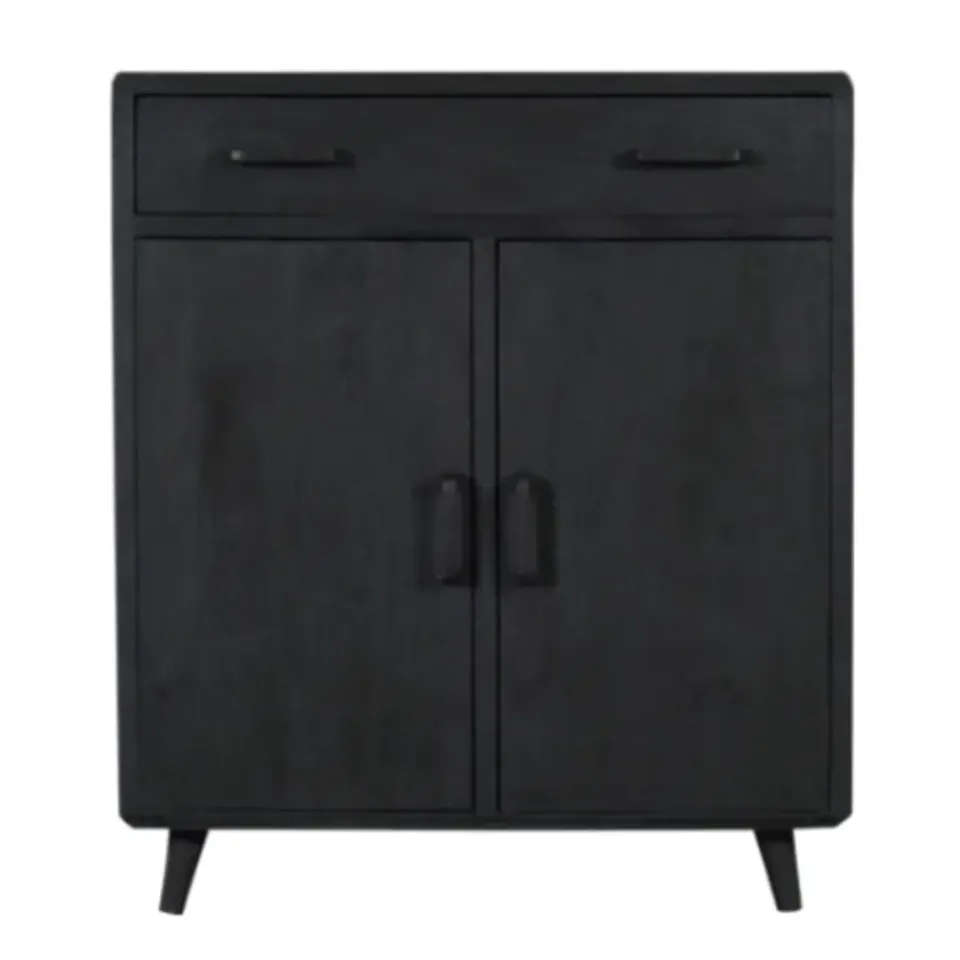 Kabinet kast Omaha Black is een stijlvolle toevoeging aan elke woonkamer. Het meubel is volledig uitgevoerd in mangohout en beschikt over één lade en twee deuren. De ladenkast is ingelegd met verschillende stroken zwart gelakt hout, wat het meubel zijn eigentijdse karakter geeft.