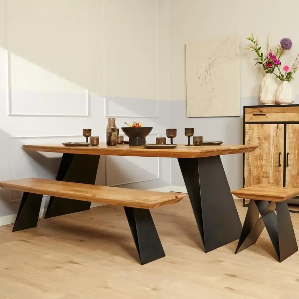 Deze kruk is gemaakt van mangohout met een metalen onderstel, wat zorgt voor een stijlvolle en duurzame constructie.