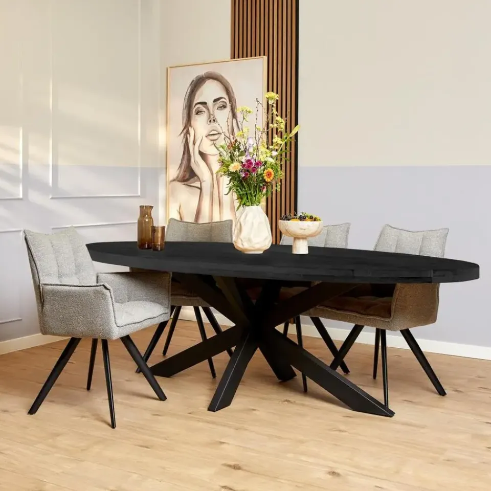 De ovale eettafel Denver is een stijlvolle en functionele aanwinst voor elke woonkamer. Met zijn zwarte kleur en ovale vormgeving creëert hij een moderne en elegante sfeer.