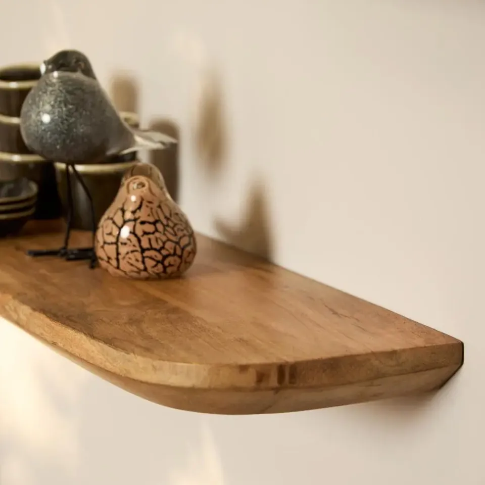 Materiaal: Deze wandplanken zijn gemaakt van hoogwaardig mangohout, een duurzaam materiaal dat bekend staat om zijn stevigheid en unieke houtnerfpatronen. Mangohout is een milieuvriendelijke keuze, omdat het afkomstig is van bomen die hun vruchten hebben gedragen en daarna worden gekapt voor houtproductie.