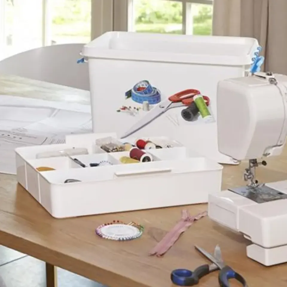 Onze Q-line 22L naaidoos is speciaal ontworpen om de meest uiteenlopende naaispullen in op te kunnen bergen. Deze naaibox is uitgerust met een extra inzetbak waar je de kleinere naaibenodigdheden in kunt opbergen zónder ze kwijt te raken. Stoffen, scharen en andere grotere naaispullen kun je gemakkelijk in het onderste deel van deze box opbergen. Zo ben je nooit meer op zoek naar de kleine frutsels tussen al het groots in de box.Deze naaibox is voorzien van een leuke decoratieve print op de zijkant. De afbeeldingen zijn verwerkt ín het kunststof, waardoor deze een stuk slijtvaster zijn. Daarnaast is deze box voorzien van handige sluitclips en een extra handgreep voor meer draagcomfort. De box is perfect stapelbaar en past doorgaans ook in de standaard kasten. Inclusief inzetbak, exclusief accessoires!