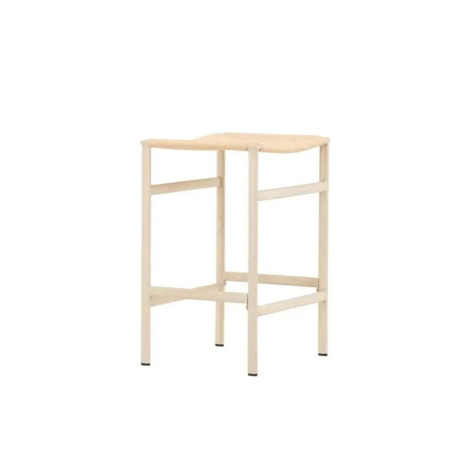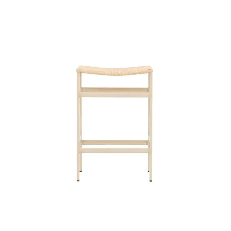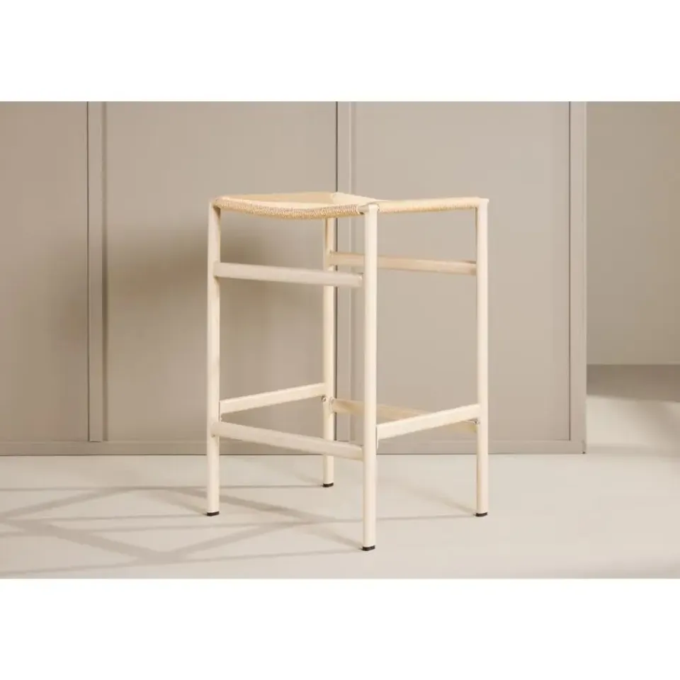 De poten van de kruk zijn witgewassen, wat ze een zachte en subtiele afwerking geeft die de natuurlijk gekleurde touwzitting complimenteert. Deze combinatie van kleuren en materialen creëert een harmonieuze en uitnodigende uitstraling die perfect past in moderne, lichte omgevingen.