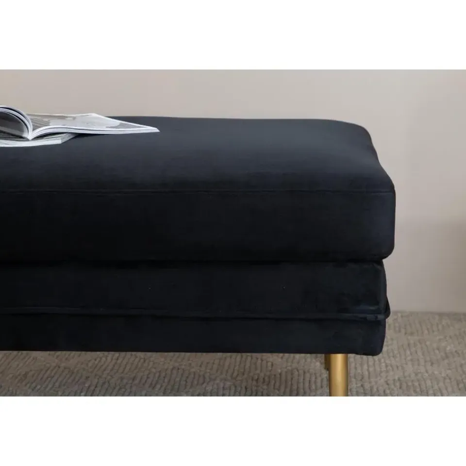 De Tess hocker is een luxueus, elegant en tijdloos meubelstuk dat een echte blikvanger vormt! Hier wordt strak Scandinavisch design gecombineerd met zachte vormen. Het doordachte geheel van de hocker zorgt ervoor dat hij net zo goed alleen kan schitteren als stijlicoon, als samen met onze fauteuil uit dezelfde serie. Uitgevoerd in een brutale zwarte kleur van fluweelzachte stof en een frame van hout en metaal. De stijlvolle smalle poten zijn van messing gepolijst metaal en vormen een mooi detail. Verhoog de interieurstijl in uw huis!