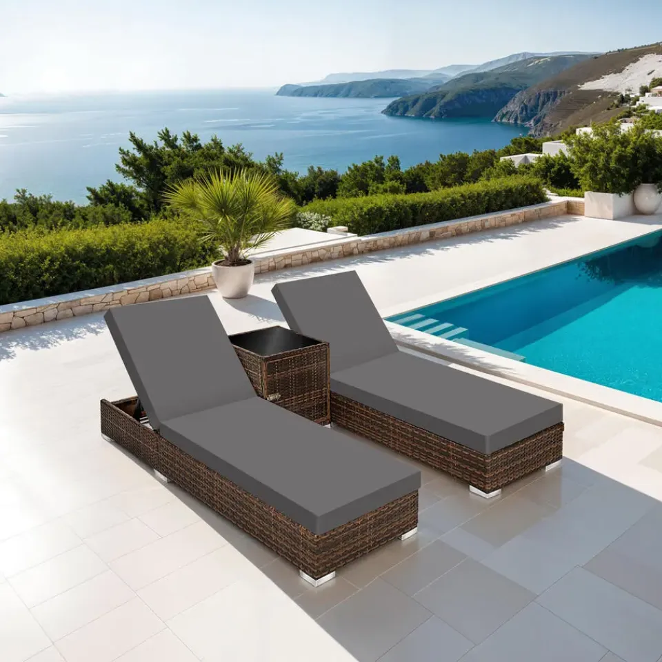 Verander je tuin of terras in een echte wellness-oase met onze hoogwaardige wicker tuinligbedden. Deze stijlvolle en comfortabele set biedt niet alleen pure ontspanning, maar geeft je buitenruimte ook een vleugje luxe. De set bestaat uit twee ligbedden en een praktische bijzettafel, ideaal voor gezellige momenten met zijn tweeën.
