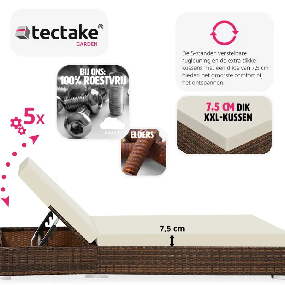 Ons ligbed is meer dan zomaar een tuinligbed. Dankzij de 5-voudig verstelbare rugleuning vind je altijd de perfecte positie, of je nu een dutje wilt doen of lekker een boek wilt lezen. De ligposities variëren van ongeveer 28,5 cm (vlak) tot ongeveer 70 cm, zodat je altijd de juiste hoogte kunt instellen. Het dikke kussen van 7,5 cm zorgt voor extra comfort.