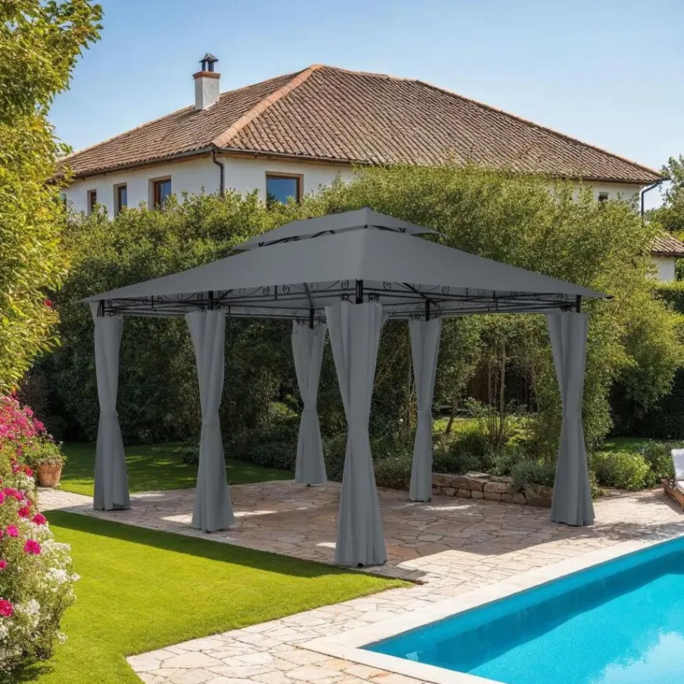Met dit luxe tuinpaviljoen met 6 zijdelen maak je van je tuin een echte feel good-oase. Als schaduwschenker op hete dagen of voor gezelige feestjes in de avonden – het paviljoen is uitstekend geschikt voor elk gebruik in open lucht. De ingewerkte ornamentversieringen geven het paviljoen een luxe uitstraling. Ook superhandig; door de zijwanden wordt je niet gestoord door nieuwsgierige blikken. Het afgezette dak laat de warmte optimaal ontsnappen en frisse lucht circuleren. Haal nu deze praktische en luxe tuinpaviljoen in huis en geniet van de zomer! Let op: Montage vereist