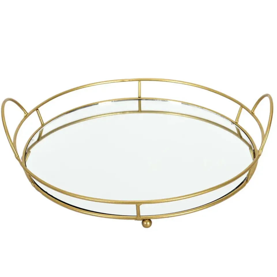 Rond Design serveer dienblad met opstaande rand voor glazen en kopjes. Materiaal: metaal en spiegel glas. Afmetingen: D34 x 4 cm. Gebruik het dienblad voor het serveren van koffie, thee, gebakjes, ontbijt, noem maar op. Deze karaktervolle, maar vooral ook handige ruime serveertray is overal voor te gebruiken. Kleur: goud.