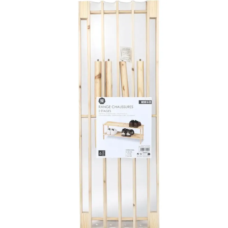 Schoenenrekje van hout, 2-laags met ruimte voor ongeveer 6 paar schoenen. Gemakkelijk in elkaar te zetten, wordt geleverd inclusief gebruiksaanwijzing. Formaat: ca. 74 x 26 x 20 cm. Materiaal: hout (zilverspar).