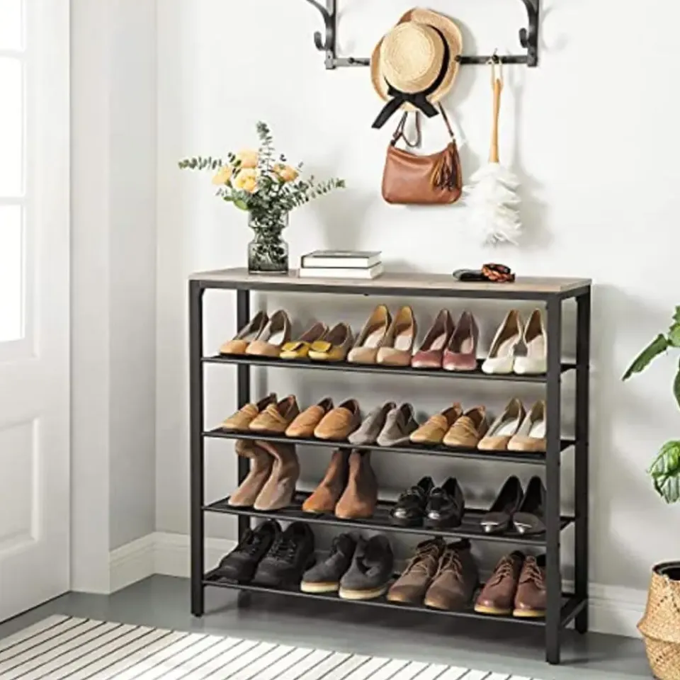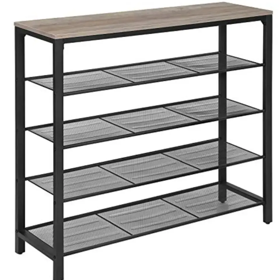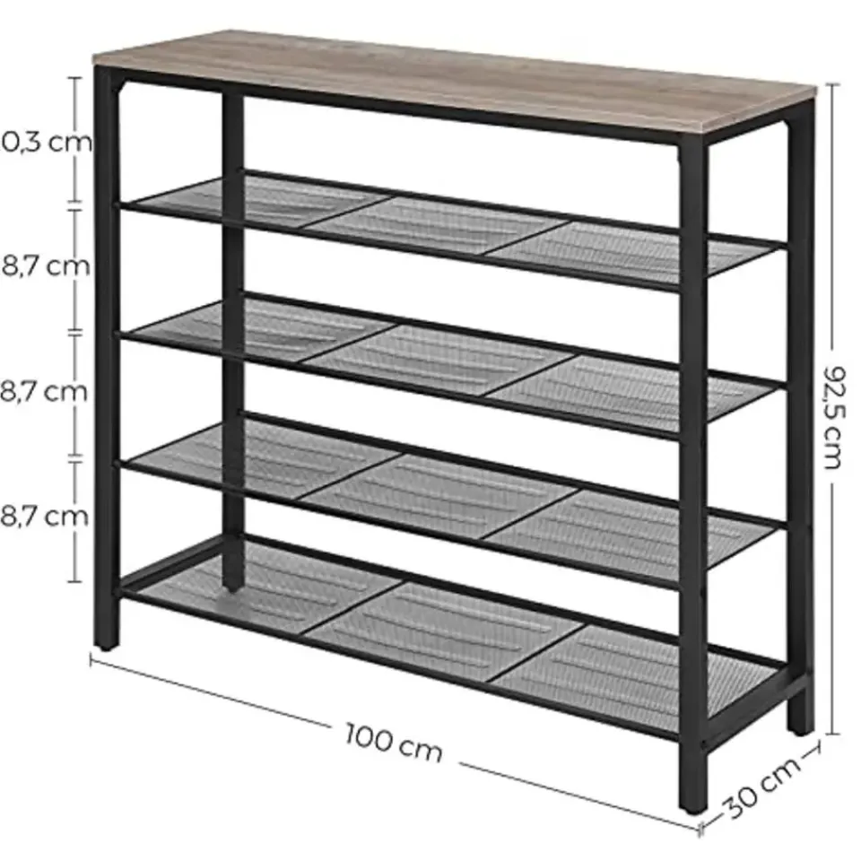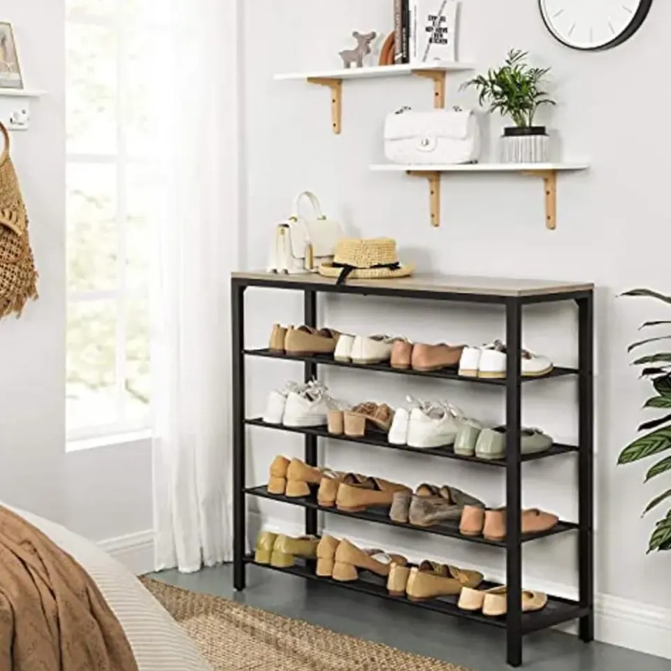 Dit 5-vaks schoenenrek is een ideale keuze om je schoenen op orde te houden en tegelijkertijd een stijlvolle entree te creëren. Het wordt gekenmerkt door een moderne industriële stijl met een beige en zwarte afwerking. Deze schoenenopberger is uitgerust met een prachtig afgewerkt houten oppervlak en vier zwarte gaasplanken voor veel ruimte om je schoenen op te bergen. De bovenste plank heeft een draagvermogen tot 10 kg, terwijl de gaasplanken elk tot 5 kg kunnen dragen. De verstelbare poten van dit schoenenrek zorgen voor een gelijkmatige pasvorm op ongelijke vloeren. Met de eenvoudig te begrijpen instructies is deze schoenenopberger in een paar stappen in elkaar te zetten. Koop dit schoenenrek, schoenenrek en decoratief stuk uit de INDESTIC Collection van VASAGLE voor je entree, hal, kast of slaapkamers om meer charme en organisatie toe te voegen. Het heeft een afmeting van 39,4″L x 11,8″B x 36,4″H en weegt 23,4 lb. Dit pakket bevat een schoenenbank, accessoireset en instructies. Koop deze TRIPLE-BONUS schoenenopberger om te genieten van de voordelen van esthetische charme, veel opbergruimte en eenvoudige installatie.