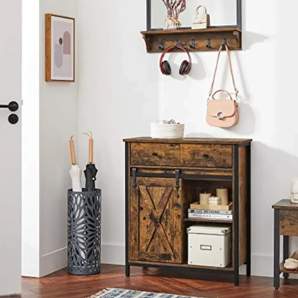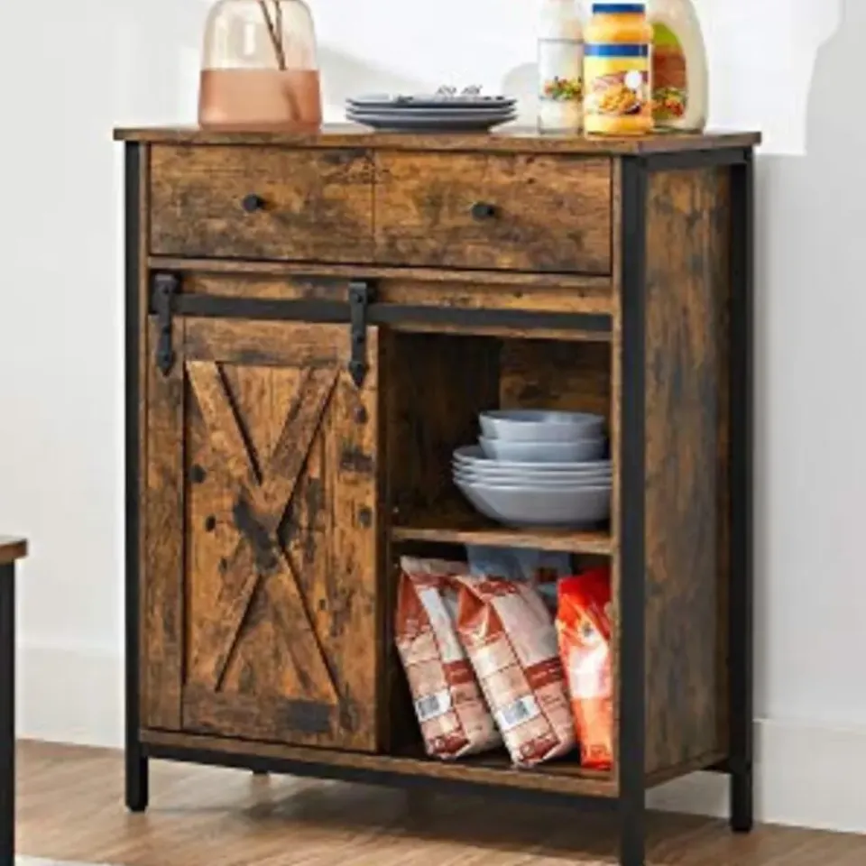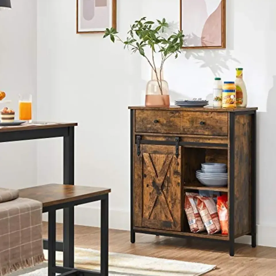 De VASAGLE COBADO opbergkast, dressoir en tv-kast is de perfecte aanvulling voor elke ruimte die extra opbergruimte nodig heeft. Of je nu op zoek bent naar een industrieel tintje in je woonkamer, eetkamer, slaapkamer of badkamer, deze vrijstaande kast met 1 lade en schuifdeur heeft alle opbergmogelijkheden die je nodig hebt. Om te beginnen heeft de kast 3-4 opbergvakken achter de schuifdeur, met twee verstelbare planken met elk drie hoogte-opties voor kopjes en glazen, een brede lade voor lepels en dienbladen en een groot oppervlak bovenop voor het opzetten van een dessertbuffet. Vergeet het urenlange in elkaar zetten van meubels, dankzij de eenvoudig te volgen instructies is deze schoonheid in een handomdraai in elkaar gezet. Bovendien hebben de stevige stalen poten van dit dressoir elk een verstelbare voet aan de onderkant, zodat de kast stabiel en wiebelvrij blijft staan. De kast is gemaakt van duurzaam spaanplaat en sterke stalen buizen en kan tot 30 kg gewicht dragen op de legplank, 10 kg op de binnenste planken en 5 kg in de lade.Voor een meubel dat eindeloos veelzijdig is en ademt met industriële charme, moet je zeker eens kijken naar de VASAGLE COBADO Opbergkast, Dressoir en TV-kast.