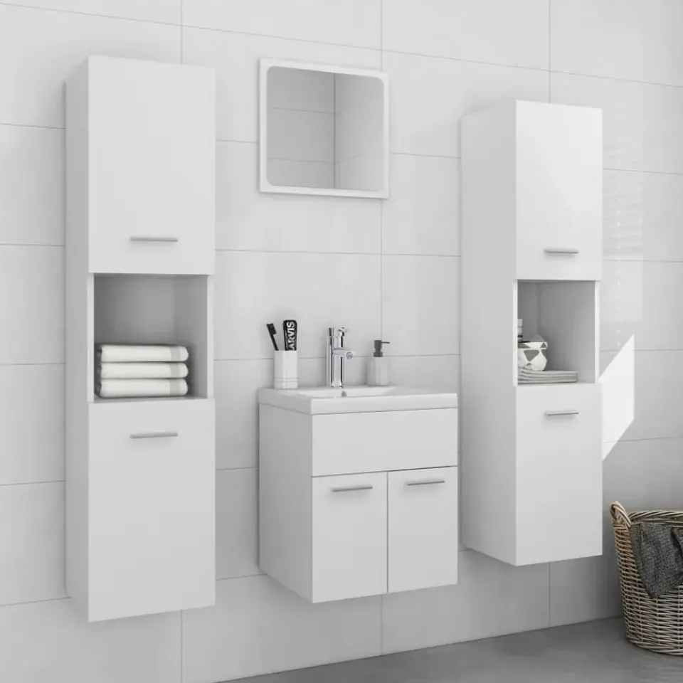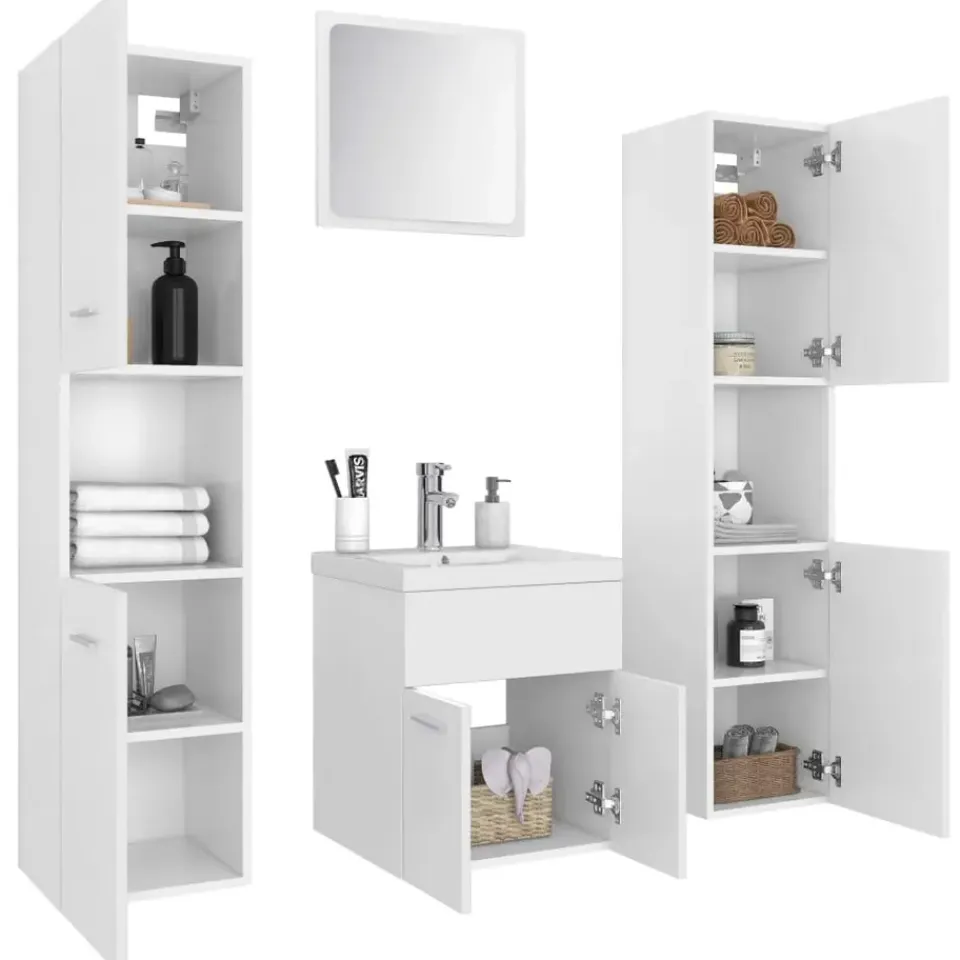 De meubelset bestaat uit een wastafelkast, twee hoge kasten en een spiegel. De chique wastafelkast heeft 1 vak en het bovenblad daarvan is ideaal voor het plaatsen van de wastafel. Elke hoge kast heeft in totaal 5 vakken en 2 deuren, waardoor er voldoende ruimte is om spullen in je badkamer op te bergen. De spiegel geeft je interieur een prachtige uitstraling. Deze badkamerset is gemakkelijk schoon te maken met een vochtige doek.