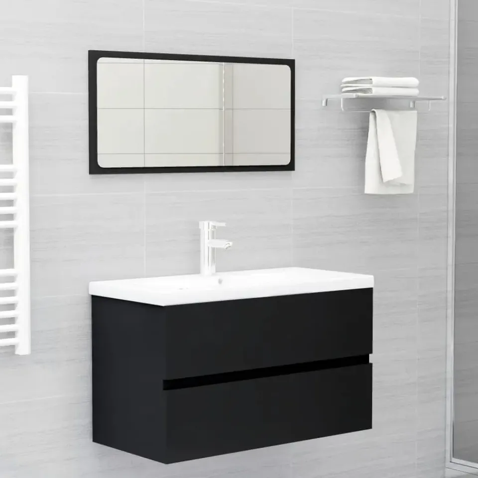 Deze trendy badkamermeubelset, bestaande uit een wastafelkast, een inbouwwastafel en een spiegel, past perfect bij je badkamer of wasruimte. Hij heeft een opvallende, opgeruimde uitstraling.