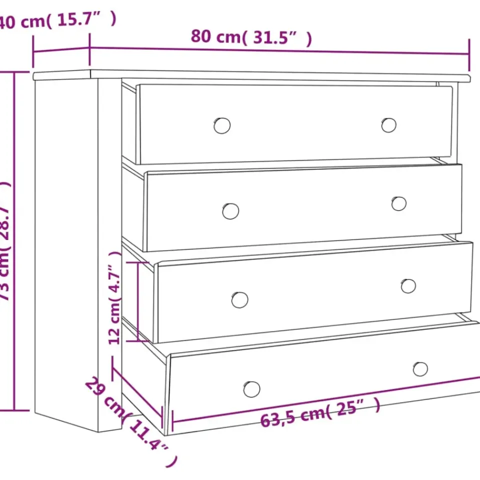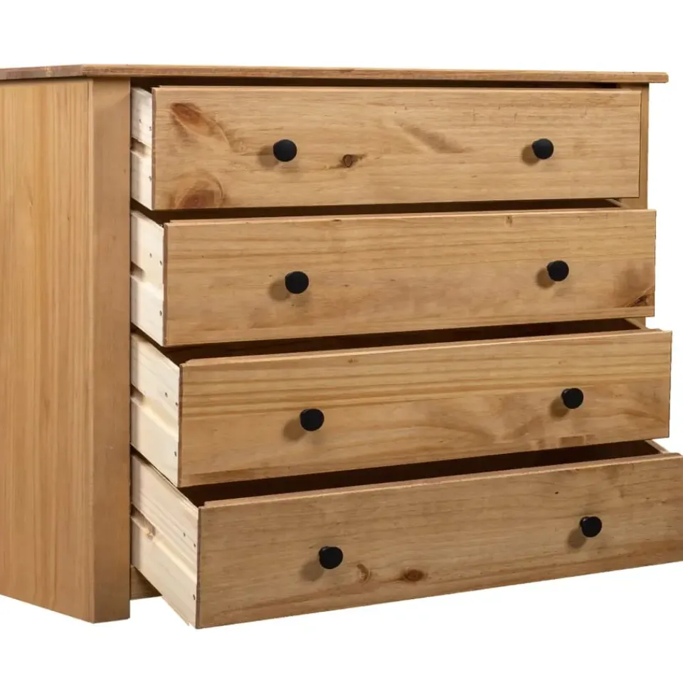 Deze Panama ladekast is gemaakt van massief grenenhout en is zeer duurzaam en stevig. Het dressoir biedt veel opbergruimte dankzij de 4 lades. Het stevige blad is ideaal voor het weergeven van decoratieve objecten, fotolijsten en potplanten. Hij is gemakkelijk schoon te maken met een droge doek. De kast is eenvoudig te monteren.