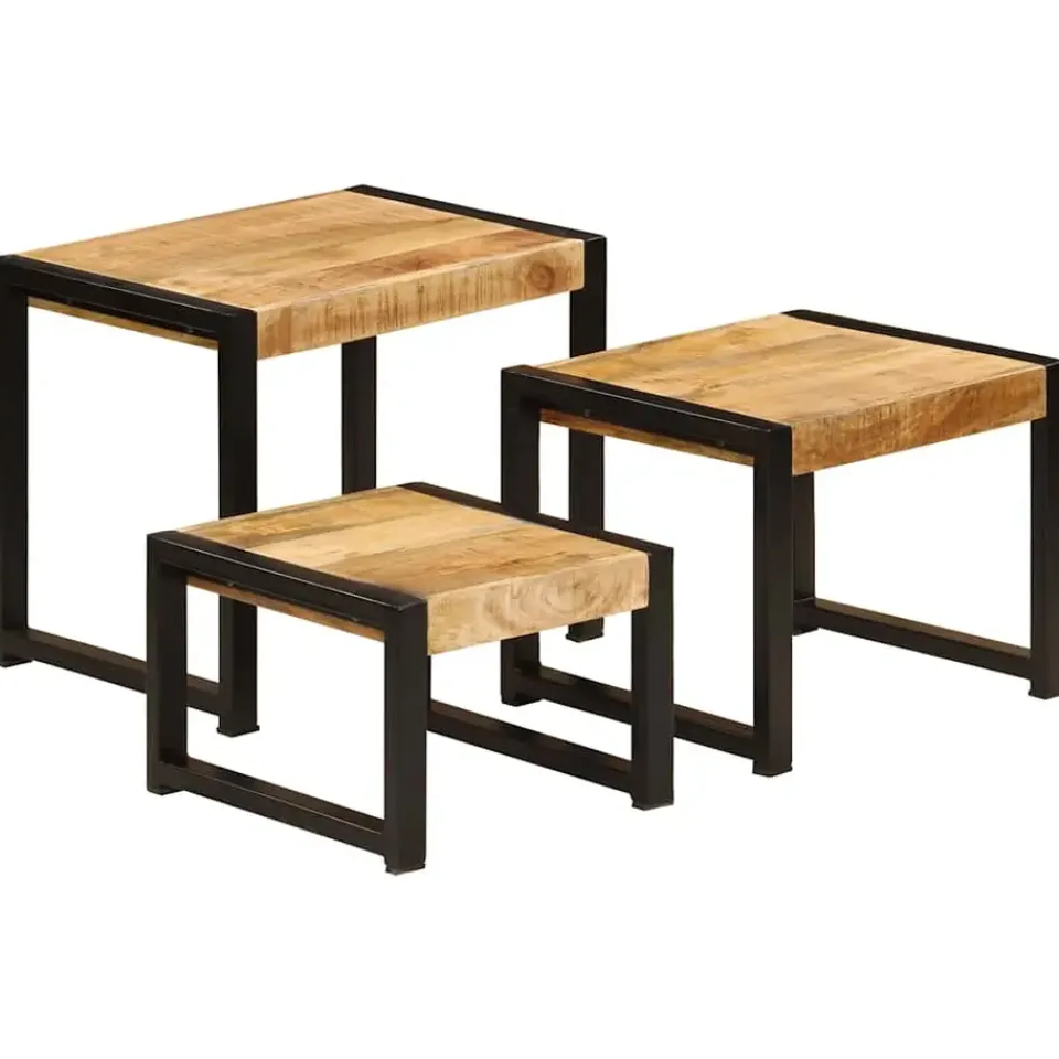 Deze set in vintage stijl is gemaakt van massief mangohout, waardoor hij zeer stabiel en duurzaam is. Mangohout is een dicht en robuust hardhout met prachtige bruine of gouden strepen en contouren op het oppervlak. Dankzij het versterkte stalen frame zijn de tafels zeer stabiel en duurzaam. Doordat ze in elkaar passen, besparen ze veel ruimte wanneer ze niet worden gebruikt. Het vakmanschap draagt bij aan de spectaculaire retro stijl van deze tafels. Elke stap van het proces wordt met de grootste zorg uitgevoerd, of het nu gaat om polijsten, schilderen of lakken.