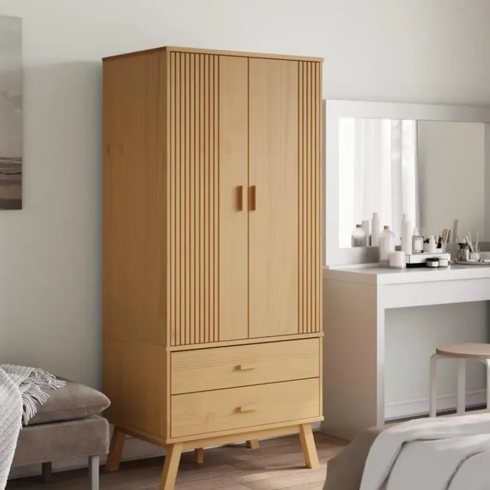Deze klassieke houten kledingkast met Scandinavisch design biedt veel opbergruimte en houdt je kleding en accessoires netjes geordend.