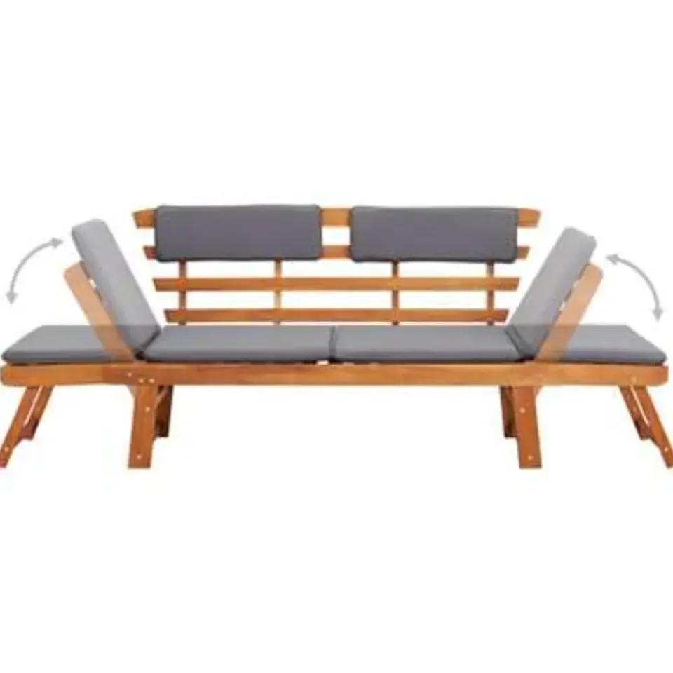 Het ligbed kan snel en eenvoudig worden omgebouwd van een bank naar een tuinbed en weer terug dankzij de verstelbare zijkanten. Beide zijden zijn ontworpen met extra poten voor extra ondersteuning. De dikke en verwijderbare rug-, zit- en armkussens zorgen voor zit- en ligcomfort. De kussenhoezen kunnen eenvoudig verwijderd en gewassen worden. De bodem van het bed met lattenontwerp zorgt voor goede ventilatie tijdens het loungen. Ons ligbed/tuinbank is gemaakt van acaciahout, een tropisch hardhout dat weerbestendig is, en afgewerkt met een lichte oliecoating. Daarom is het geschikt voor buitengebruik.
