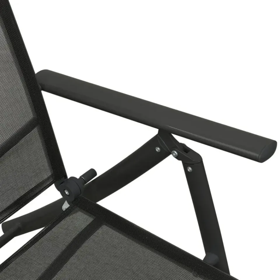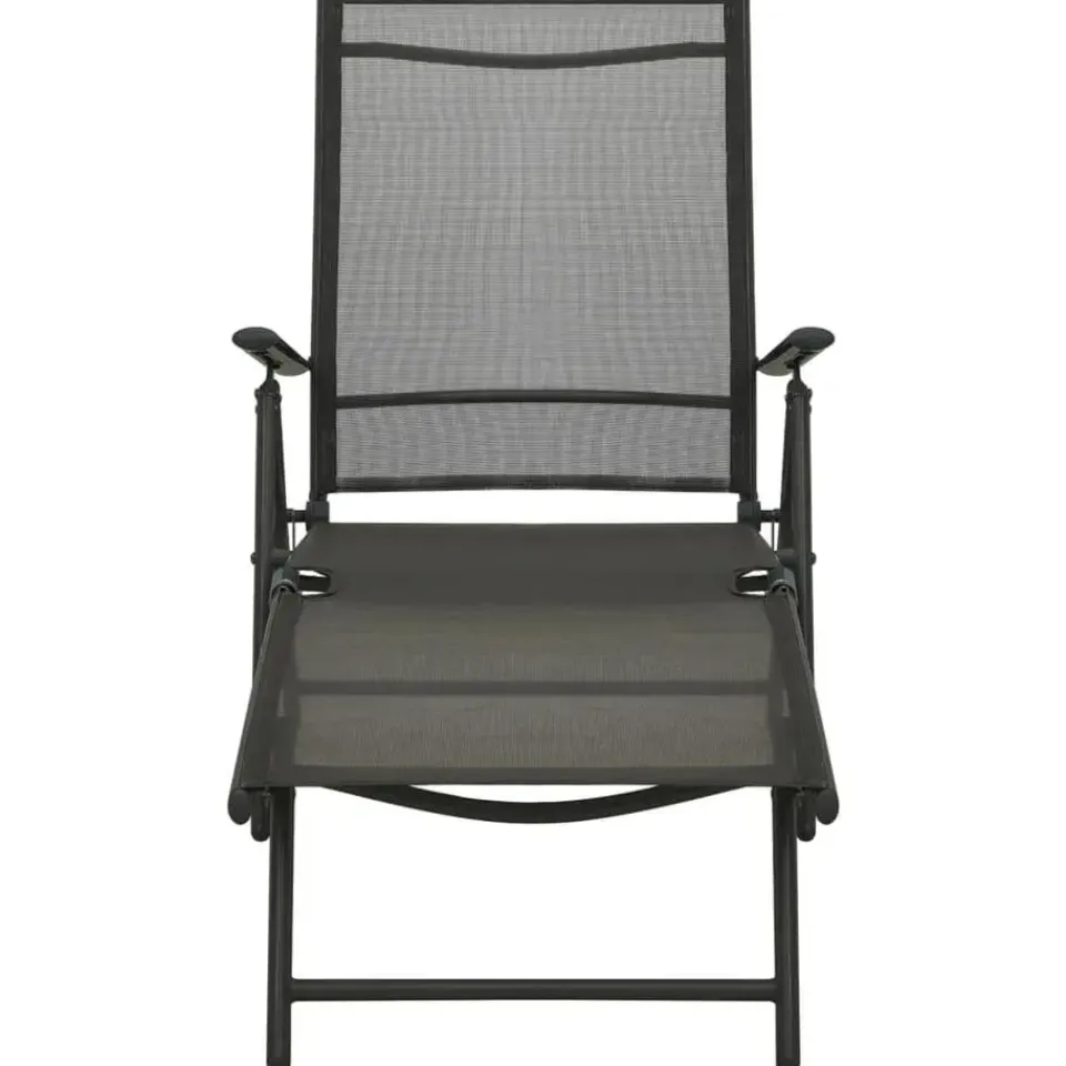 Het gepoedercoat aluminium frame maakt de set stevig en duurzaam. De armstoel heeft een verstelbare rugleuning, zodat je altijd de meest comfortabele houding kunt vinden. De zitting is comfortabel met ademend textileen. De voetensteunen dragen bij aan het comfort. Je kunt ze ook gebruiken als tafeltjes om drankjes en etenswaren binnen handbereik te plaatsen.