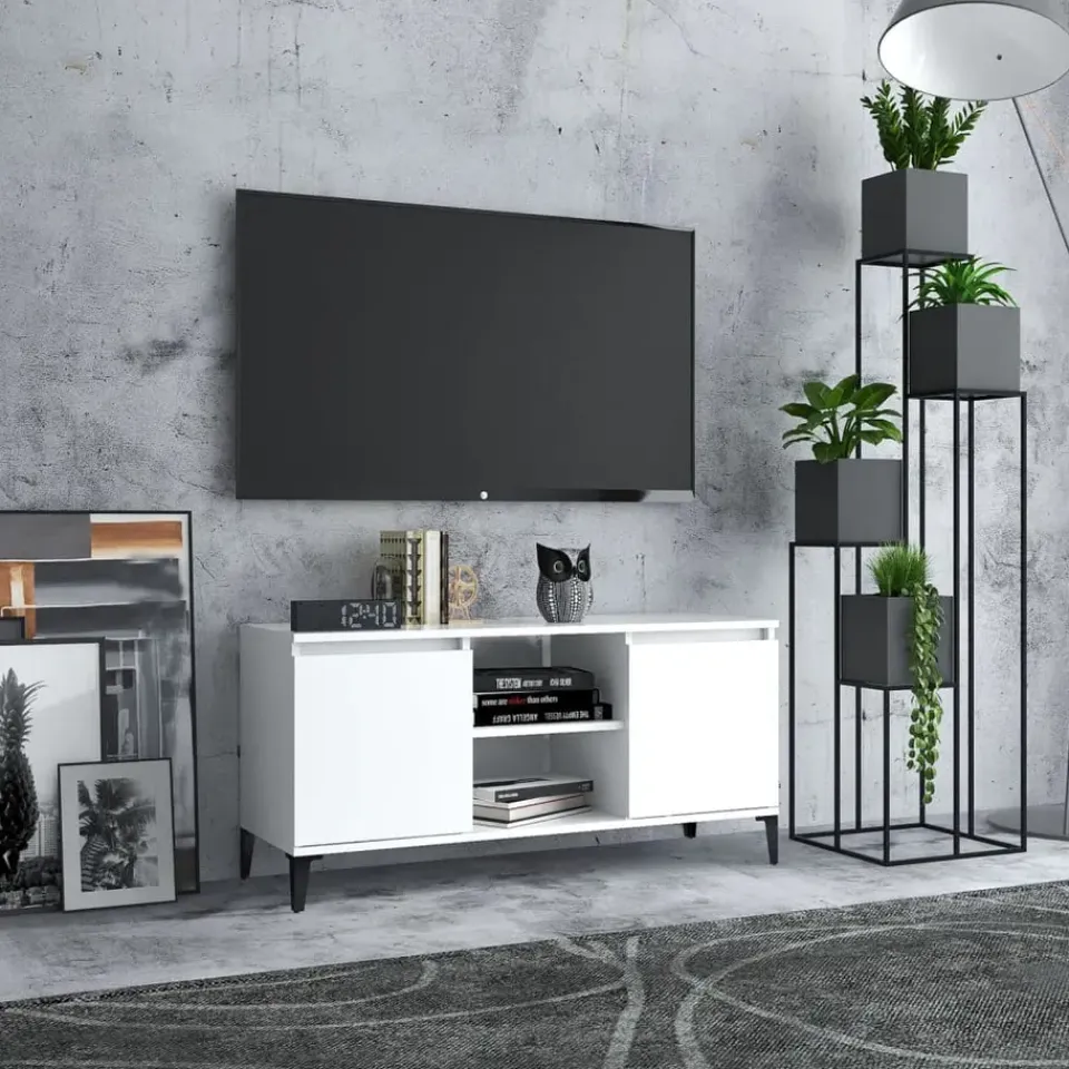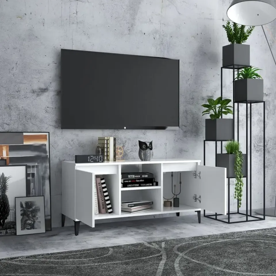 Dit televisiemeubel met 4 metalen poten is stabiel en stevig. Het dressoir is ontworpen met 2 schappen en 2 vakken en biedt voldoende ruimte om tijdschriften, boeken, dvd’s en multimedia-apparaten overzichtelijk en binnen handbereik op te bergen. Bovendien is het meubel gemakkelijk schoon te maken met een vochtige doek.