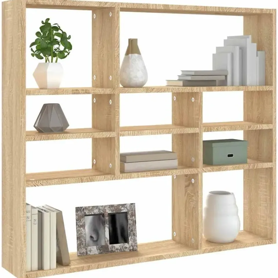 Dit wandmeubel is gemaakt van bewerkt hout en is stevig en duurzaam. Het heeft 10 open vakken zodat er voldoende plek is voor het plaatsen van boeken, verzamelobjecten, foto’s, prijzen, potplanten, enz. Bovendien is dit meubel gemakkelijk schoon te maken met een vochtige doek.