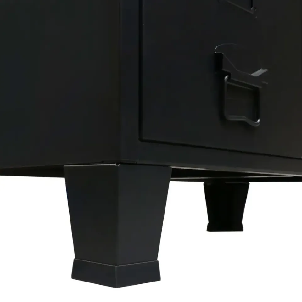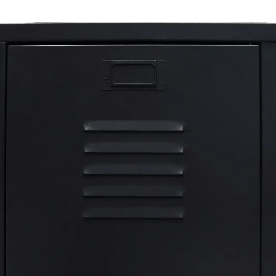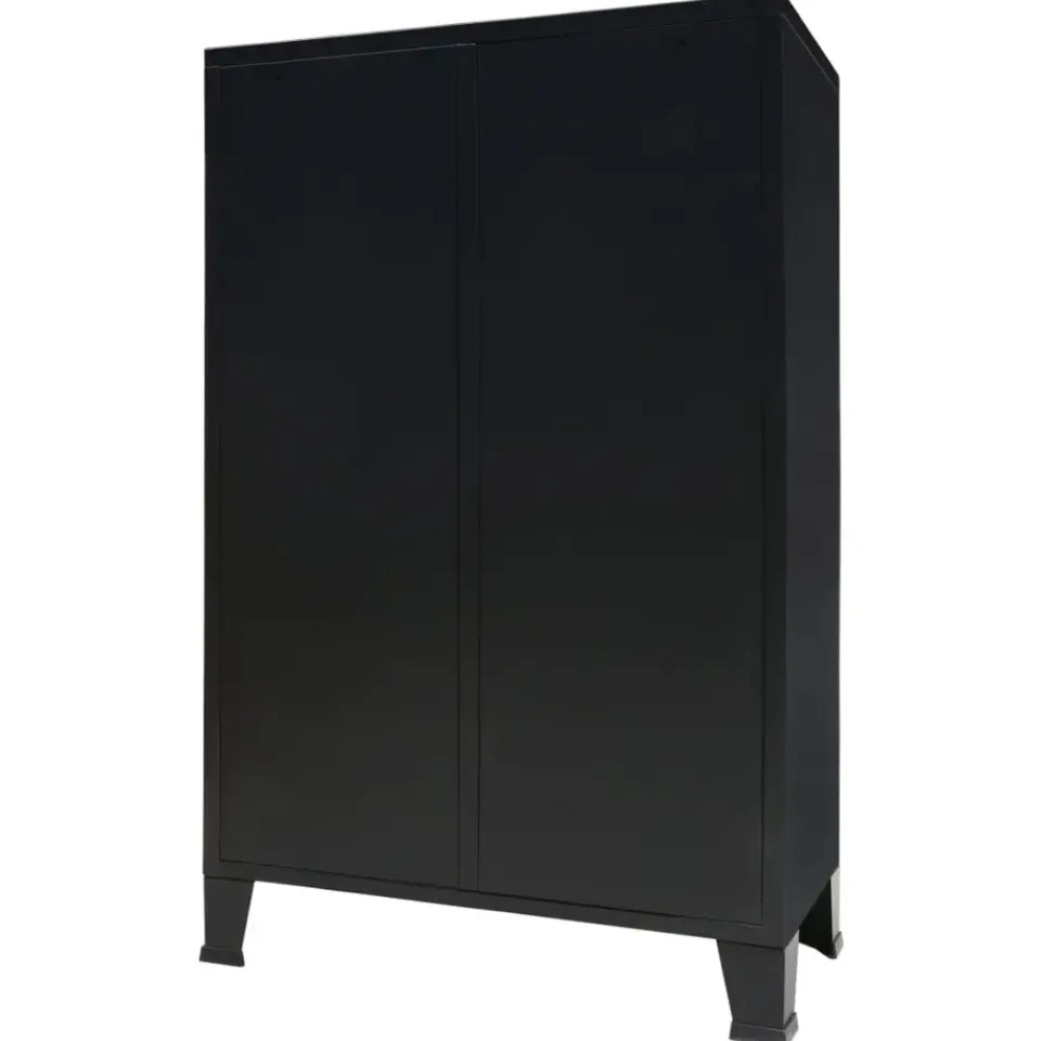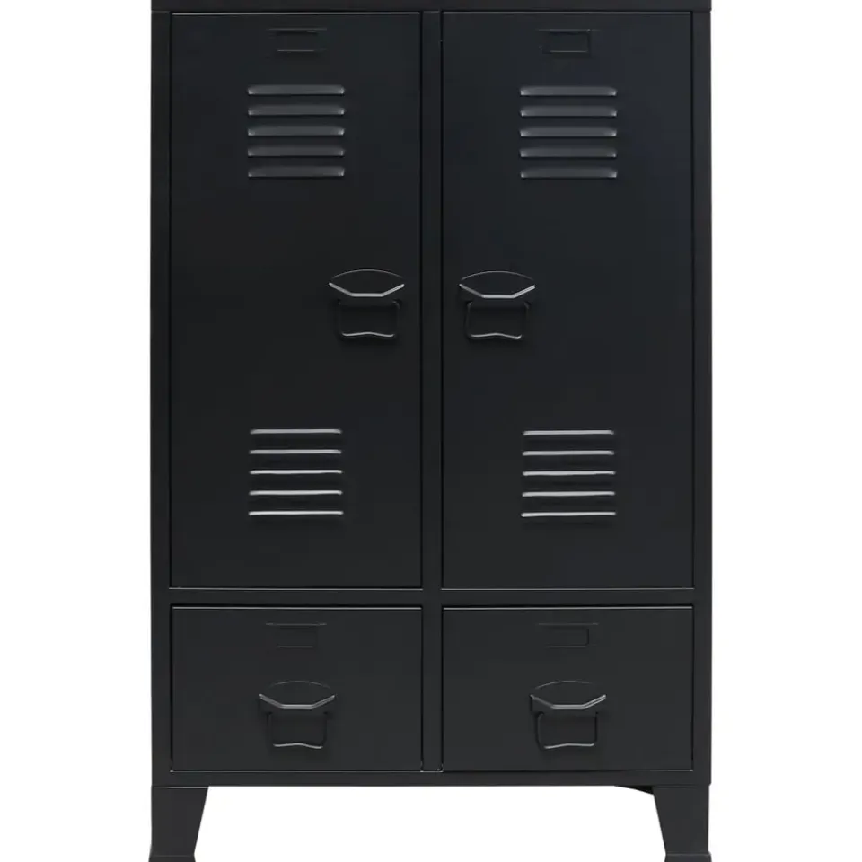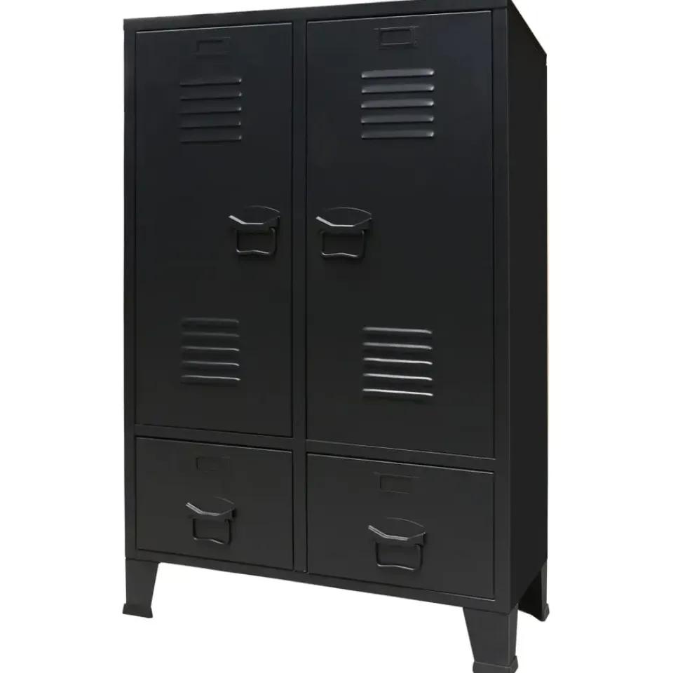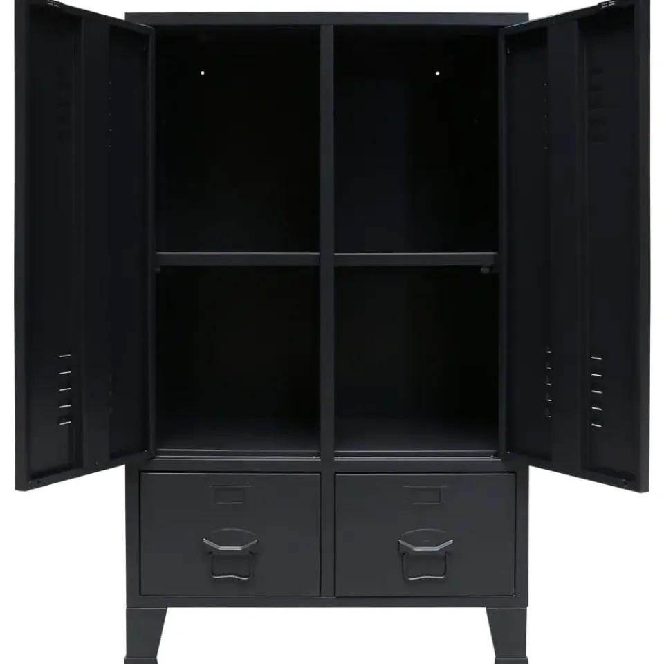 De kast heeft 2 verstelbare legplanken, waarmee je je kleding netjes in verschillende categorieën kunt sorteren, en 2 lades voor het opbergen en ordenen van je sokken, ondergoed, enz. Elke deur heeft een naamkaarthouder en ventilatiegaten die bijdragen aan de industriële uitstraling. Deze opbergkast is gemaakt van plaatmetaal, waardoor hij duurzaam en gemakkelijk schoon te maken is. Montage is eenvoudig.