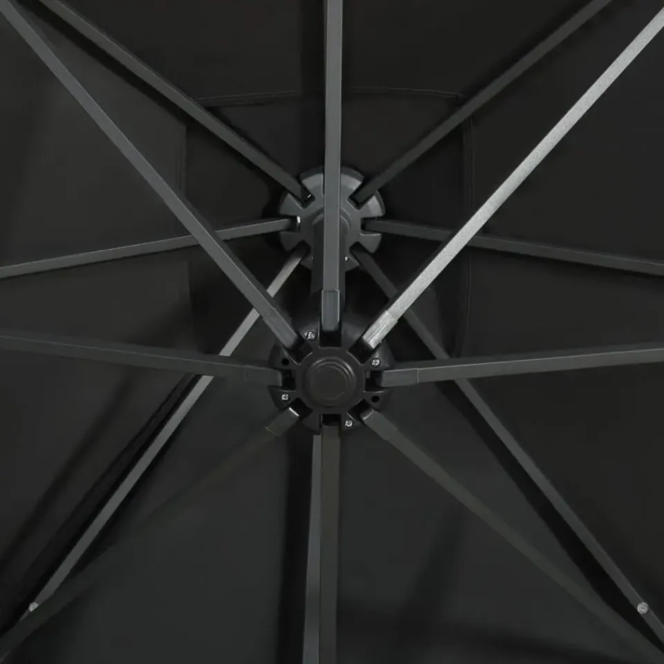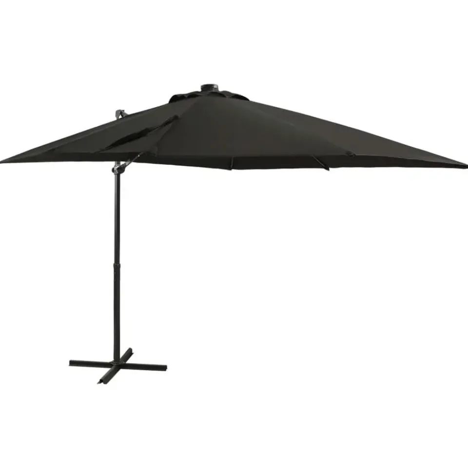 Deze elegante zweefparasol met LED-verlichting is de perfecte keuze om wat schaduw te creëren en jezelf te beschermen tegen de schadelijke uv-straling van de zon. Wanneer de zon ondergaat, verlichten de LED’s je buitenruimte.