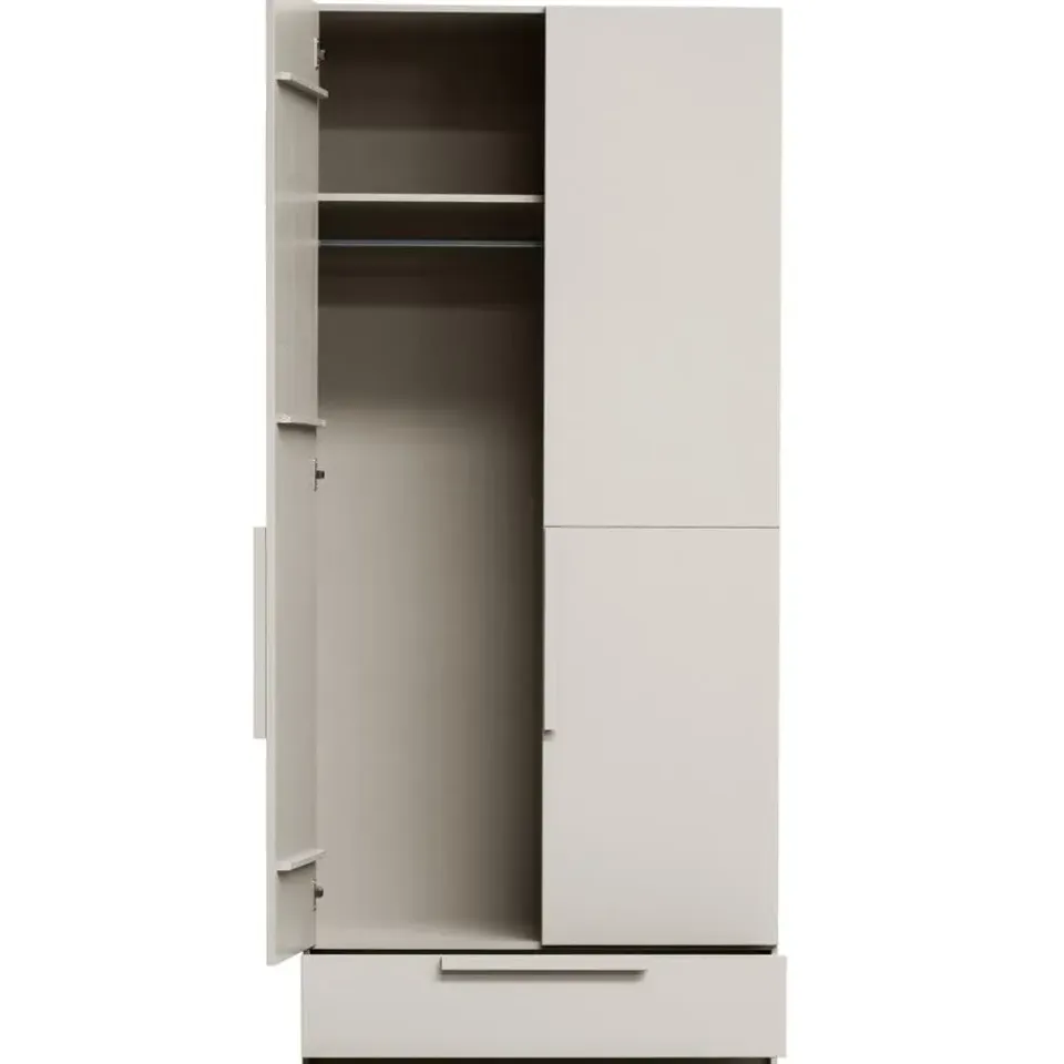 De kast is uitgerust met een metalen roede en voorzien van een geluidloos softclose-systeem voor de deuren en laden, wat extra gebruiksgemak biedt.