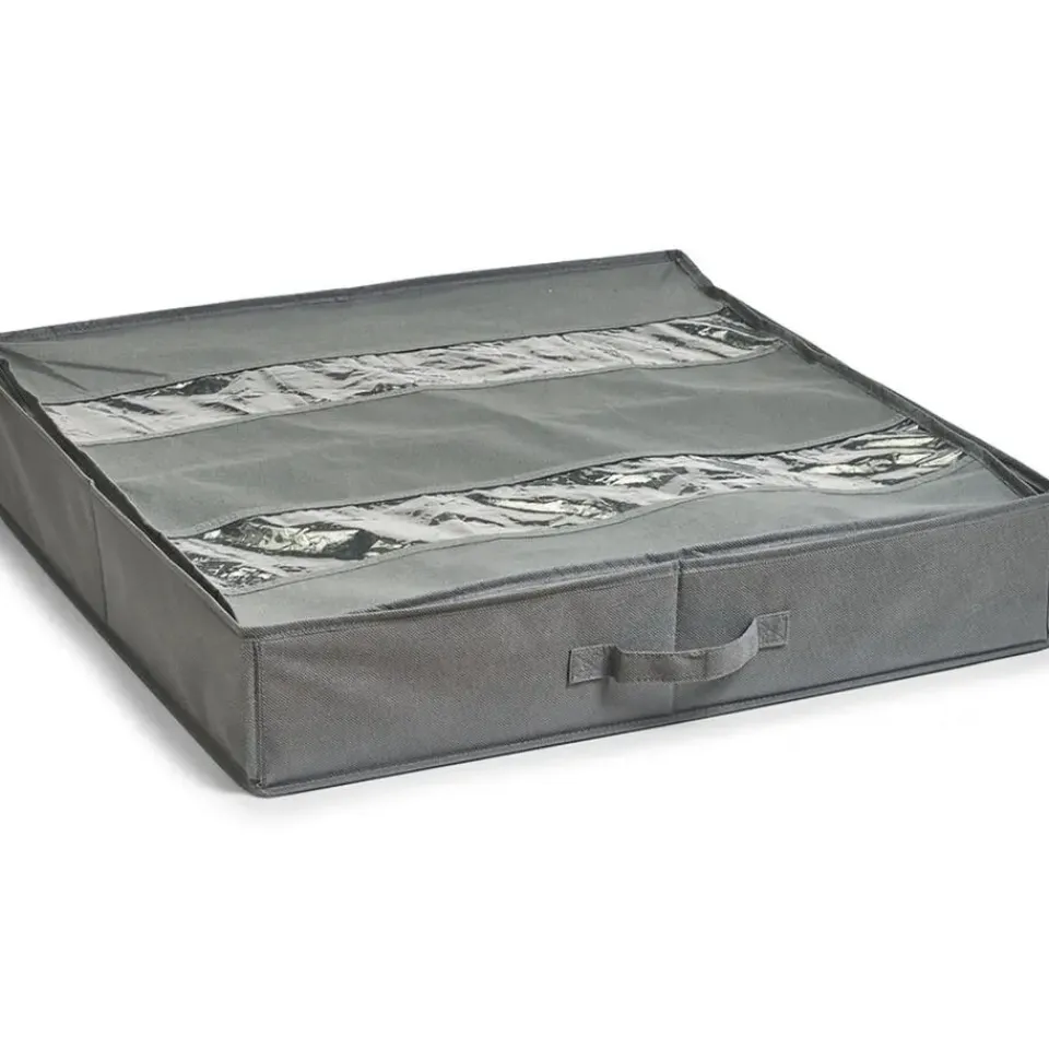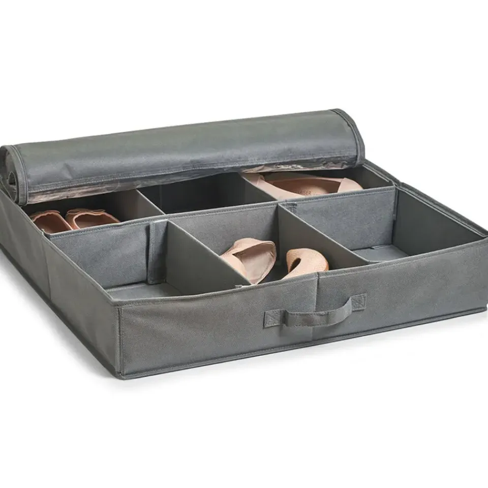 Zeller schoenen opberger/organizer met 6 vakken in de kleur grijs. Handige opbergtas om o.a. schoenen en laarzen op te bergen onder het bed of in de kast. De hoes beschermt je schoenen tegen schimmel, vocht en stof. De vakken zijn flexibel in te delen door middel van het klittenband. Zo kun je bijvoorbeeld 1 groot vak voor laarzen en 3 kleinere vakken voor schoenen maken. Het kijkvenster aan de bovenzijde toont de inhoud en met het handvat aan de voorzijde schuif je de tas eenvoudig onder het bed/uit de kast vandaan. Materiaal: polyester. Afmeting: ca. 60 x 60 x 13 cm.